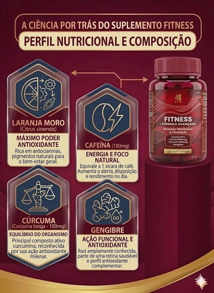 Você faz sua parte. O Fitness faz o resto. Quatro ativos que trabalham juntos: a laranja moro ativa a queima de gordura, a cafeína desperta o metabolismo sem agitação, a curcumina apaga a inflamação que impede a recuperação e o gengibre melhora a circulação e potencializa tudo. Separados são ingredientes. Juntos, fazem sentido. Pra quem já se esforça e precisava do suporte que faltava.